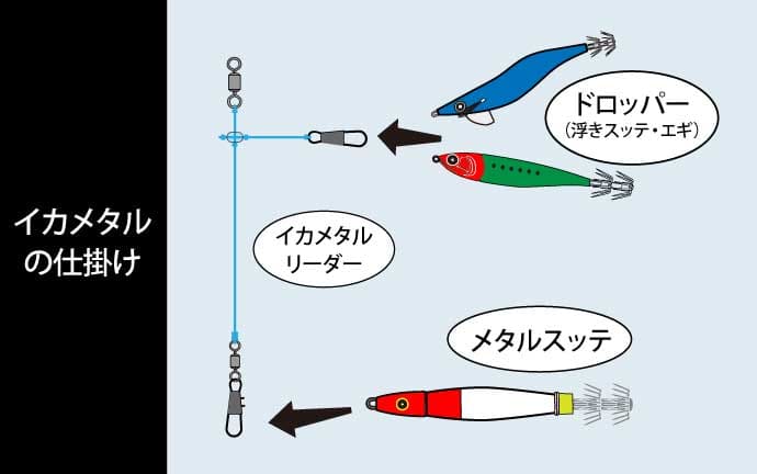 特徴:リーダーの先にオモリ、その先にエギを付けて釣る釣り方